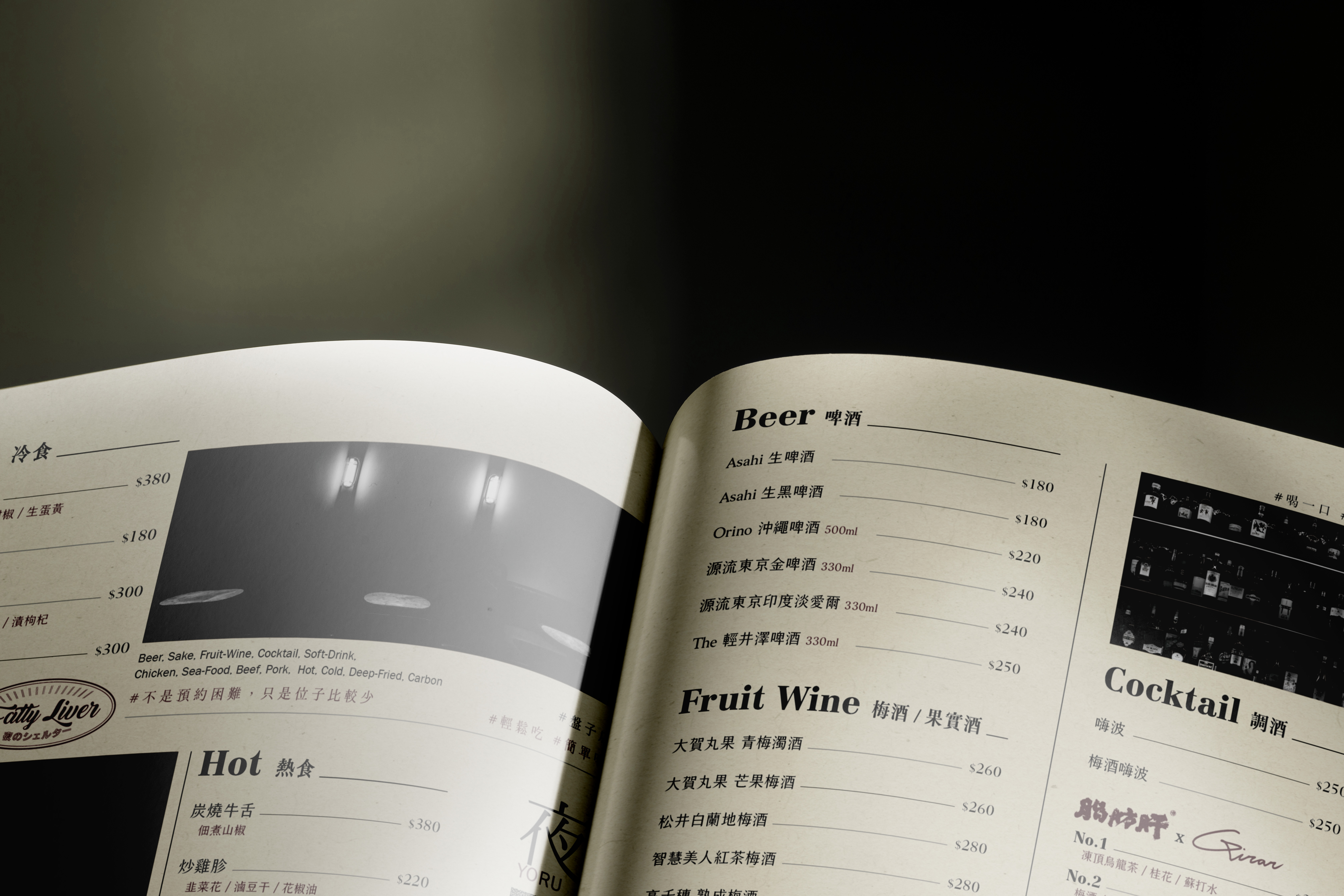 為高雄在地一位難求的深夜小料理,日洋和食是店內的一大特色,日式與西式的風味混和帶來獨特的料理享受。為其操刀全新標誌以及店內的各式視覺需求算是一個蠻大的挑戰,在風格上必須揉合日洋特色,在衝突中塑造平衡,同時保持其簡約的高級感。
